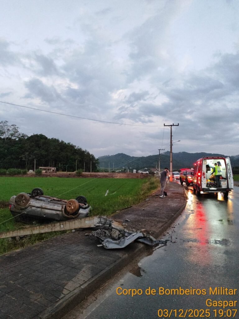 O Corpo de Bombeiros Militar de Gaspar atendeu, por volta das 18h54 desta quarta-feira (3), a uma ocorrência de saída de pista seguida de colisão contra um poste e capotamento na Rua Arthur Poffo, no bairro Santa Terezinha.