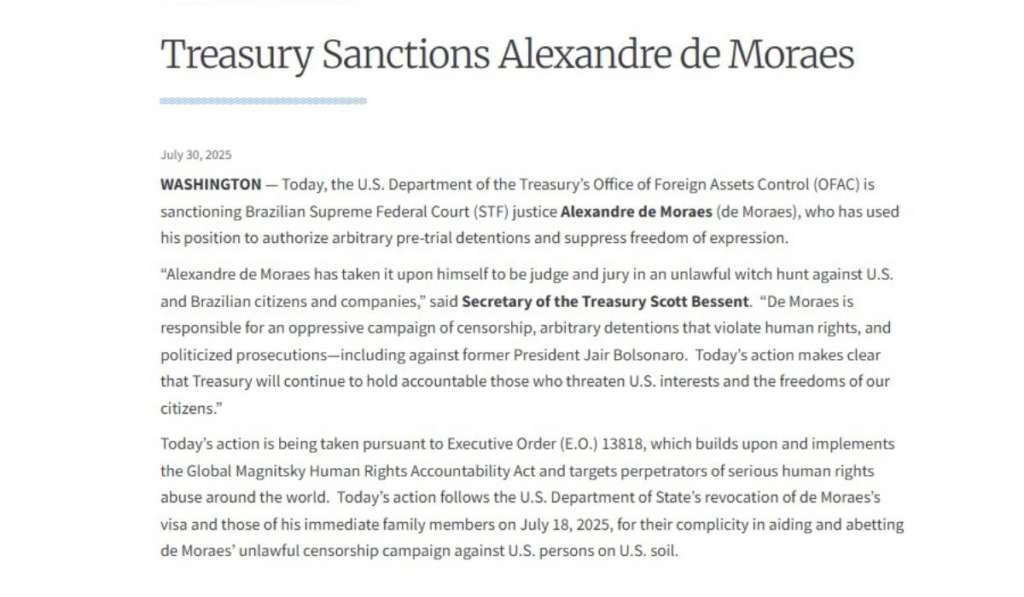 O secretário do Tesouro dos Estados Unidos afirmou que: “Alexandre de Moraes se colocou como juiz e júri em uma caçada ilegal contra cidadãos e empresas dos EUA e do Brasil”, disse.