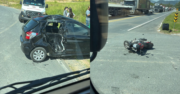 Na tarde desta segunda-feira, por volta das 14h55, um acidente de trânsito envolvendo um automóvel Ford Ka e uma motocicleta foi registrado na BR-470, no km 92, no bairro Ribeirão São Luiz, em Apiúna.