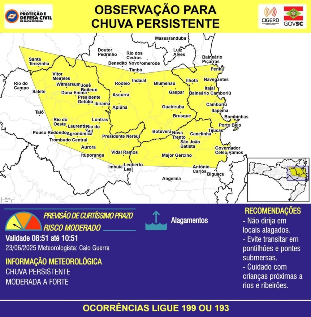 A Defesa Civil de Apiúna segue acompanhando as condições climáticas e orienta que a população fique atenta aos comunicados oficiais. Em caso de dúvidas ou necessidade de apoio, os moradores podem entrar em contato pelos números 199 ou 193.