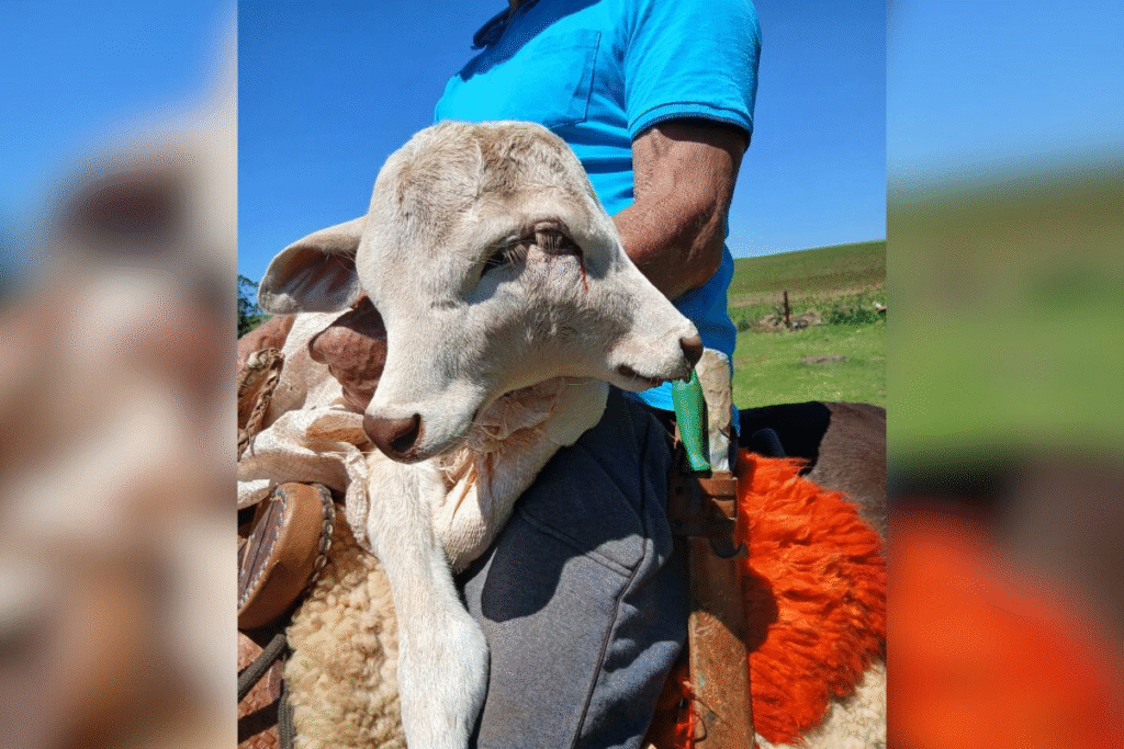 Com a ajuda de um cavalo, ele levou o bezerro para outro local a fim de mostrar à família. “Todo mundo ficou ali tirando foto”, contou, rindo da cena inusitada registrada na propriedade.