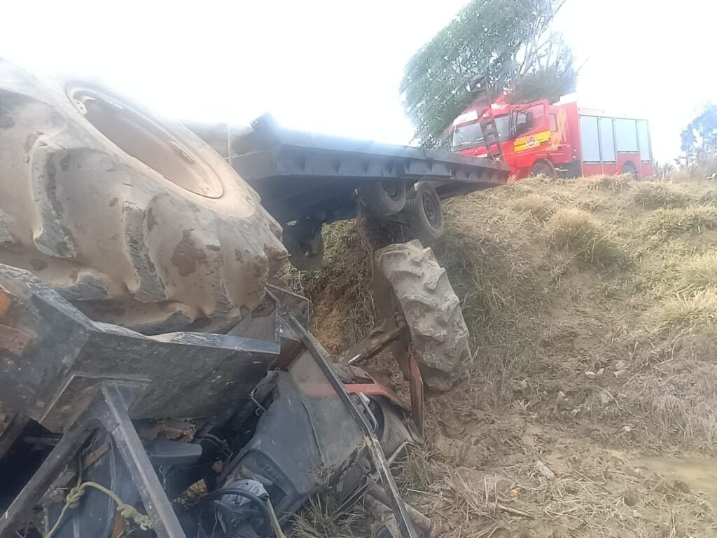 Segundo os bombeiros, o trator da marca Massey Ferguson, que estava carregado com mourões de eucalipto – peças de madeira utilizadas como postes na construção de cercas em áreas rurais – saiu da pista e capotou.