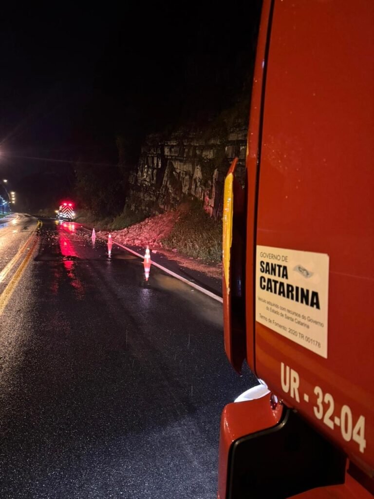 Na madrugada desta segunda-feira (22), os Bombeiros Voluntários de Ascurra–Apiúna–Rodeio foram acionados por volta da 1h53 para atender a uma ocorrência de queda de barreira no km 95 da BR-470, nas proximidades do posto fiscal, em Apiúna.