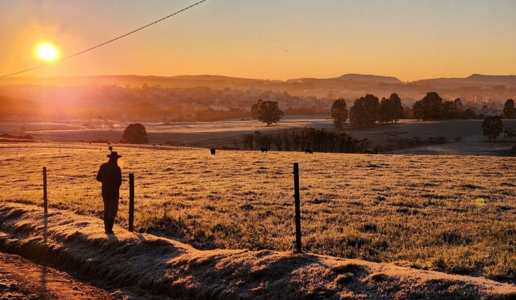 O pico de frio da semana deve ocorrer no amanhecer da terça-feira (1°), quando as mínimas ficam entre 2°C e -4°C no Oeste e nos planaltos, podendo chegar a valores ainda menores nos pontos mais altos da Serra. Nestas áreas há condições para a formação de geadas.