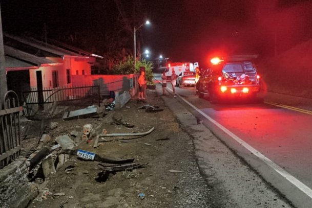 Carro sai da pista e colide contra poste e muro em Rodeio (SC)