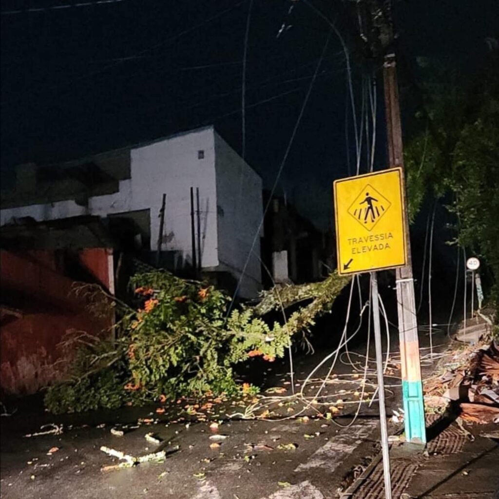 Durante a madrugada, fortes ventos derrubaram árvores e causaram queda de fiação elétrica em diversos pontos da cidade. A imagem mostra uma rua interditada por galhos e fios, representando o risco à população.