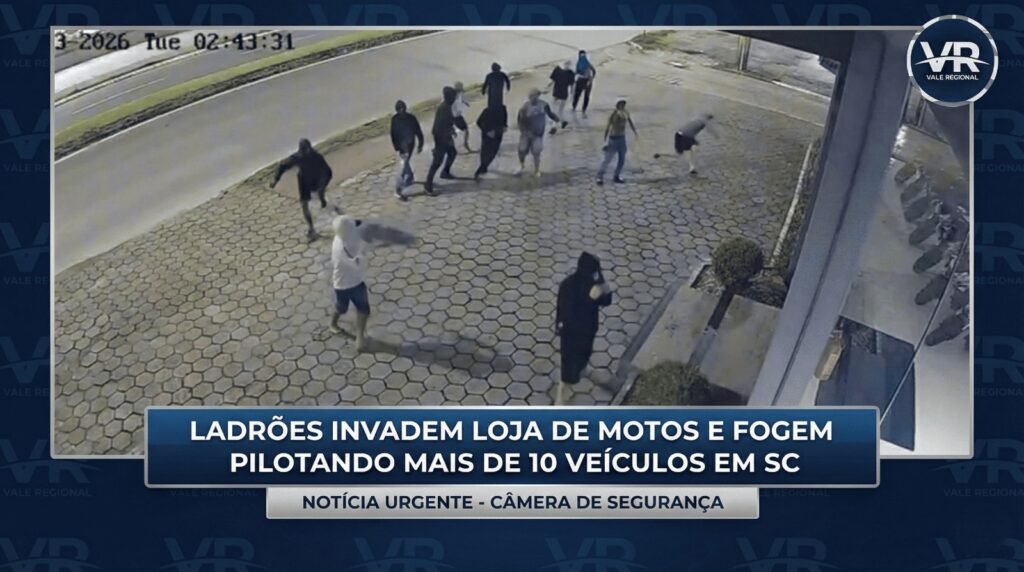 Uma loja de motocicletas foi invadida por ladrões nesta terça-feira (13) em Santa Catarina, e as câmeras de segurança registraram o exato momento em que os criminosos fogem em comboio pilotando os veículos roubados. O caso aconteceu na cidade de Itajaí, na região do Vale do Itajaí, e mobiliza a investigação da Polícia Civil.