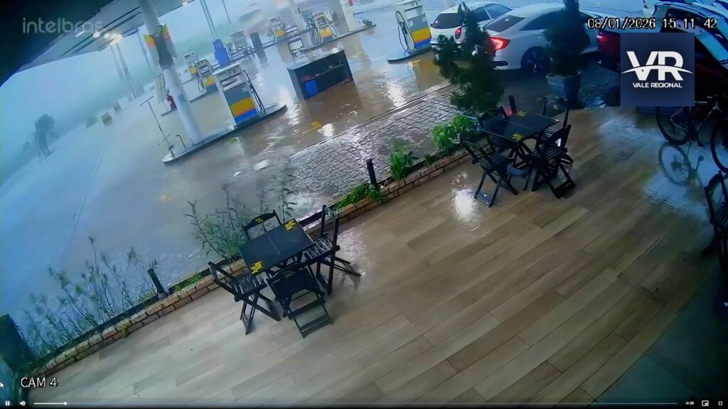 Um vídeo que circula nas redes sociais mostra o exato momento em que um vendaval derruba o teto de um posto de combustíveis em Gaspar, no Vale do Itajaí. A estrutura desaba em cerca de 15 segundos, evidenciando a força das rajadas de vento que atingiram a cidade.