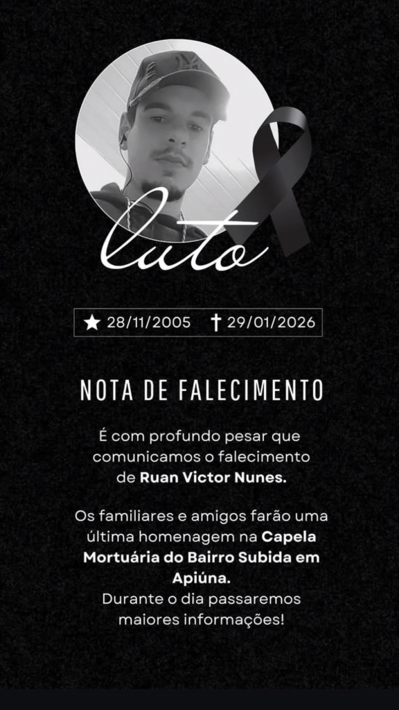 A confirmação da identidade foi feita por meio de uma nota de falecimento divulgada por familiares, que informaram que o jovem nasceu em 28 de novembro de 2005 e faleceu em 29 de janeiro de 2026.